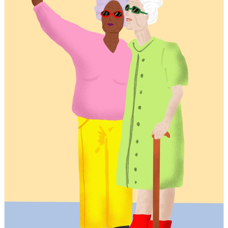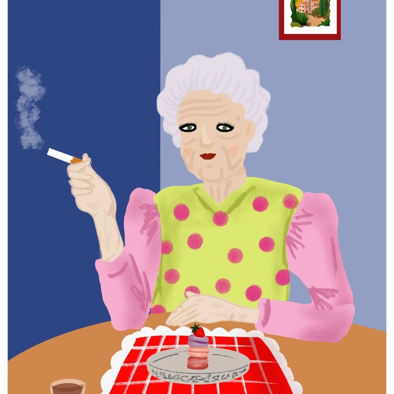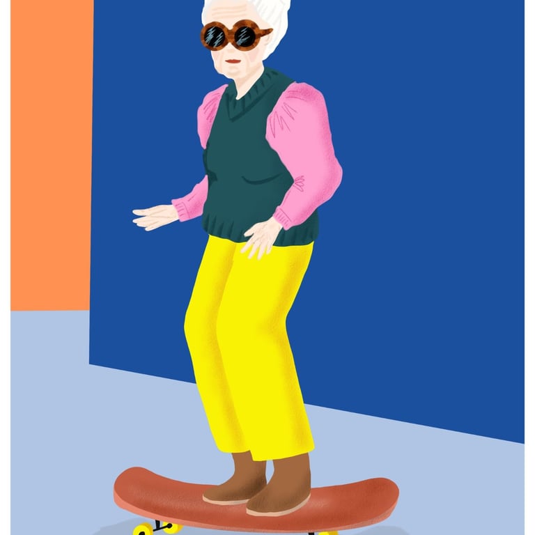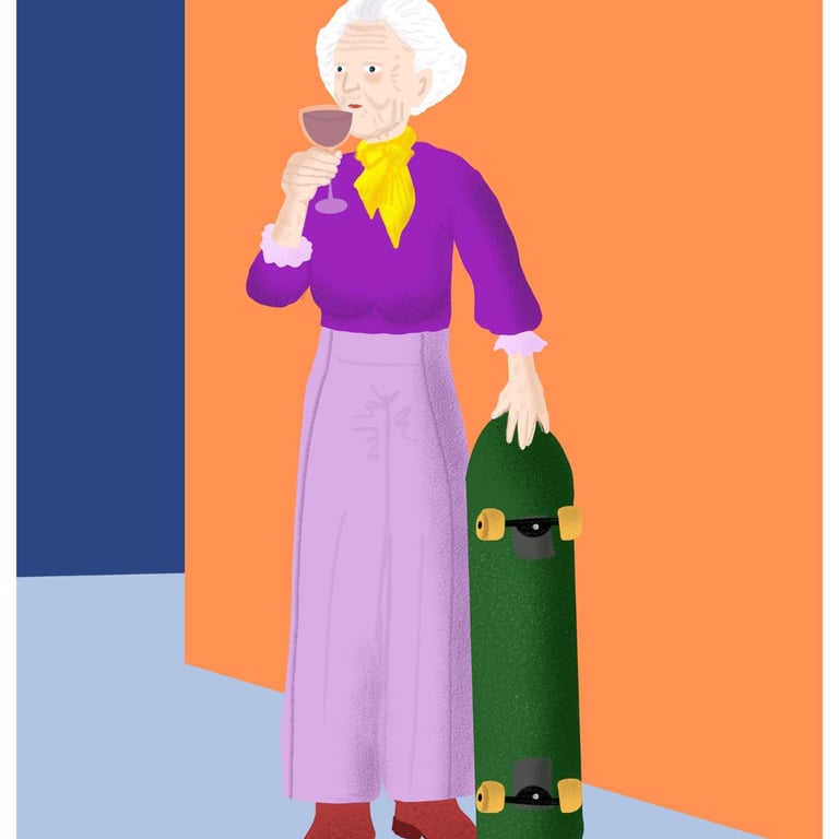 J'ai donc décidé d'illustrer une image décalée de la mamie. Une personne fun, excentrique, vieille dans son corps mais pas dans sa tête.